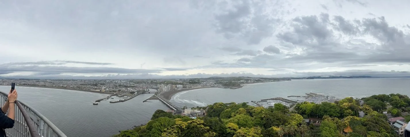 The highlight of the Samuel Cocking garden is the Enoshima Sea Candle, a lighthouse observatory tower that gives panoramic views of the coastline and Sagami Bay. There’s both an indoor and outdoor observation area—the outdoor observation area was closed when we arrived, but I noticed some staff brushing water off the steps, so we assumed it was due to the rain. We decided to hang out and see if they’d open up the outside upper observation area, and it was certainly worth the wait!