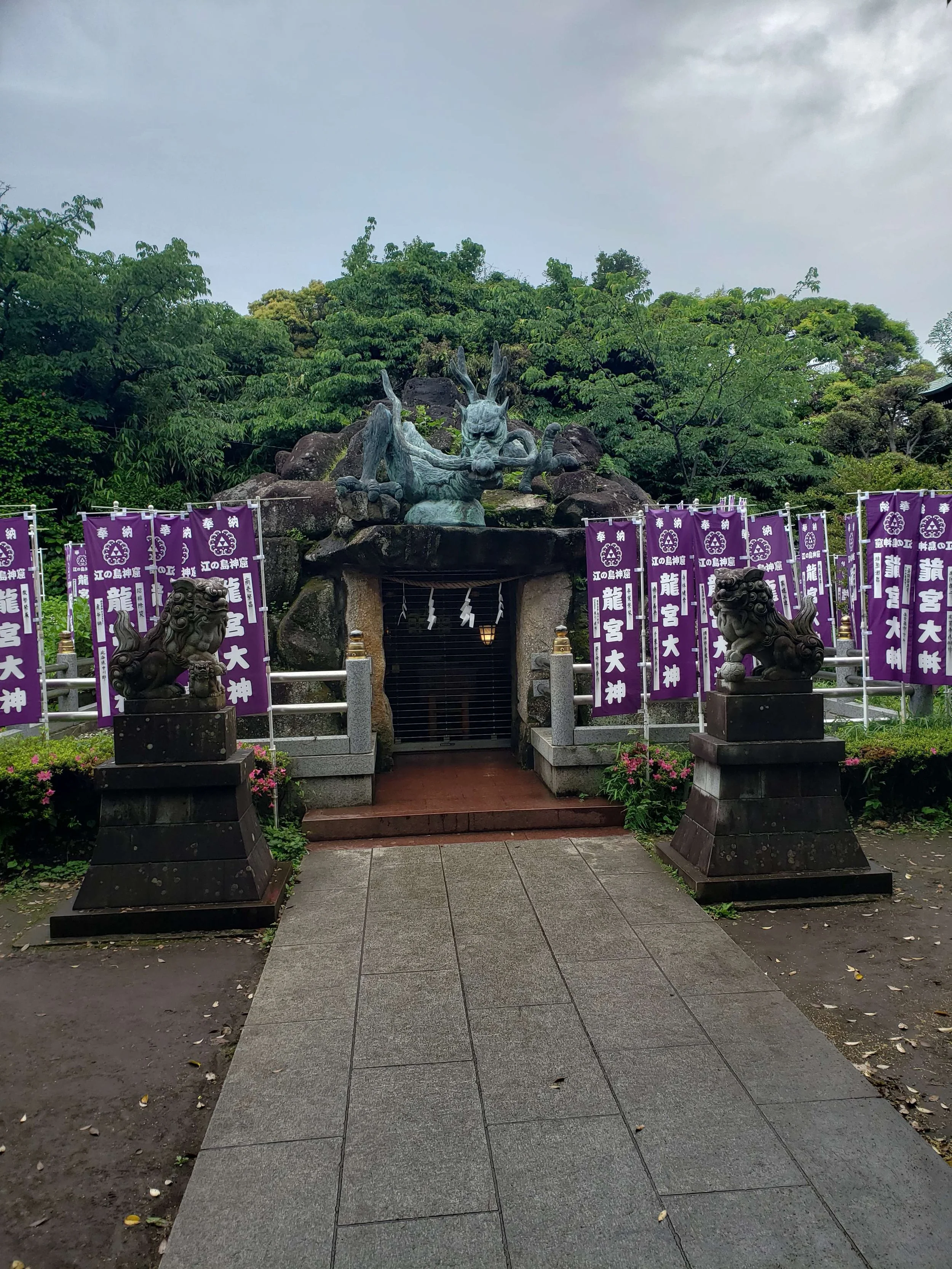 The people in the villages on the coasts went through a period of strife and suffering, plagued by earthquakes and storms and even a five-headed dragon, Gozuryu, that ate their children. This allegedly went on for about a thousand years, until the goddess Benzaiten descended from the heavens and touched the waters of the Sagami Bay, creating Enoshima island to be her home.